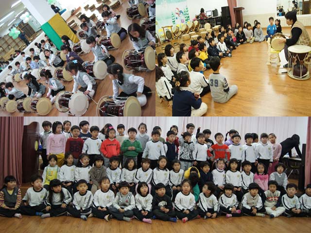 <국악>덩덩 쿵따쿵, 갱갱 게게갱, 징 징, 벙 긋 벙 긋. 내가 자신있는 국악기를 가지고 국악 시간에 배웠던 여러 장단을 한 번 더 익혀봅니다. 이렇게 배운 장단이 모여 멋진 사물놀이 공연이 된답니다. 국악 공연은 무엇보다도 공연을 보는 사람과 공연을 하는 사람 모두가 흥이 나는 것이 중요합니다. 몸은 호흡을 하고, 눈은 선생님과 신호를 주고 받고, 손으는 연주를 하면서 즐거운 공연을 준비하고 있습니다.