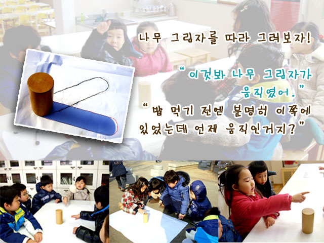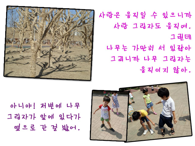 나무 그림자가 움직인다고 생각하는 어린이들: “저번에 내가 나무 그림자가 앞에 있다가 옆으로 가는거 봤어.” “나무가 움직이지 않아도 나무 그림자는 조금씩 움직여.”