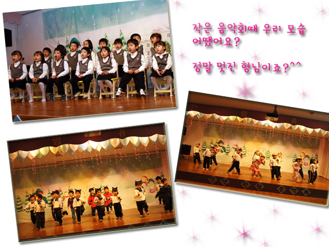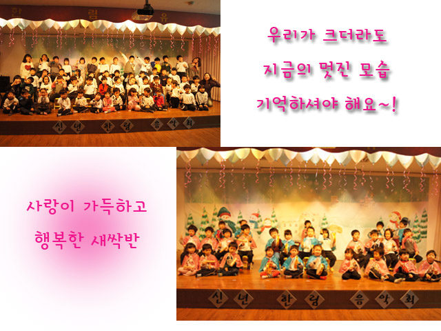 혹시나 준비기간이 아이들에게 단순히<힘듦>으로 다가가지 않을까 하는 염려가 있었지만 아이들은 힘들땐 서로 격려하며 활동 그 자체를 즐기며 참여하였습니다. 아이들이 발표회 통해 <함께함의 즐거움>을 알아가며 더 나아가 어떤 역할이 더 중요하고 덜 중요하고가 아닌 내가 나의 역할에서 최선을 다했기에 모두가 아름다울 수 있었다는 것을 배웠길 바래봅니다. 아이들과 교사를 믿어주신 부모님께 감사드립니다.♥<설날에는 무엇을 하나요??>