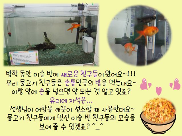 C: 어! 방학동안 물고기가 더 많아졌어! C: 어디? 정말이네. 물고기 친구들이 생겼어. C: 그런데 여긴 뚜껑이 없네. 손을 넣어도 되는 건가? C: 안 돼! 그러면 물이 더러워 질 거야. C: 그럼 우리 밥 주자! T: 이슬이, 새싹이 처럼 밥을 많이 주면 안 된대요. 이 친구들은 손톱만큼의 밥을 먹는대요. C: 어? 손잡이가 있네. 떼볼까? C: 그거 어디서 본 적 있어. 자석이야! C: 자석? 자석이 왜 어항이 있어? T: 자석은 어항을 청소 해 주기 위해 있는 거예요. C: 자석은 물고기들이 편하게 돌아다니게 끝에 놔둬야겠다.