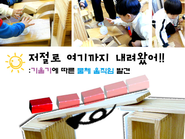 나무블록으로 친구들과 함께 어울려 공사놀이를 하던 어린이들 가운데 한 친구가 무엇인가 발견한 듯 소리칩니다. “얘들아~ 이것 봐! 내가 방금 신기한 거 발견했다!! 내가 손으로 밀지도 않았는데 이게(나무블록) 여기까지 내려왔어!! 봐! 진짜지?”
