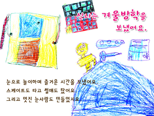 올 겨울은 유난히 춥고 눈이 많이 왔습니다. 그래서 인지 어린이들은 너도나도 눈과 함께 놀이한 이야기를 쏟아놓습니다. 스케이트를 탄 이야기, 눈사람을 만든 이야기, 눈썰매를 탄 이야기... 눈은 어린이들에게 신나는 놀이터가 되어 방학을 더욱 즐겁게 해준 것 같습니다.