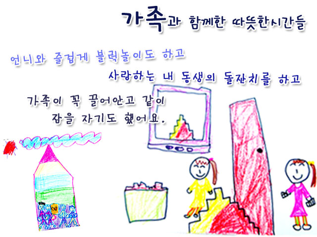 “엄마랑 아빠랑 나랑 뮤지컬을 봤어요. 정말 재미있었어요.”, “내 동생 돌잔치를 했어요. 가족도 다 모이고, 맛있는 것도 많았어요.”, “엄마랑 아빠랑 형이나 나랑 한 방에서 서로 꼭 끌어안고 잠을 잤는데, 정말 따뜻했어요.”