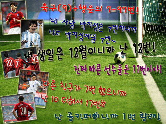 유아5: 나는 97번이요! 축구에 있는 ‘구’가 9, 그리고 행운의 숫자 7~ 그래서 97번이요!