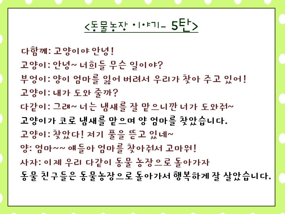 유아6: 이야기 하는 순서대로 앉아 있으면 어때? 그러면 순서도 헷갈리지 않고 차례대로 읽을 수 있잖아.