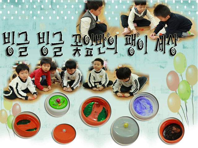 - 쌓기 영역에서 블록으로 놀이를 하던 꽃잎반 친구들은 재미있는 놀이를 발견하게 됩니다. 바로 블록으로 팽이 돌리기였지요. 팽이 돌리기에 관심을 가지게 된 친구들은 교실 안에서 다양한 매체 돌려보기 삼매경에 빠지게 됩니다. 그러다가 우유 뚜껑에 구슬을 붙여서 돌리면 팽이처럼 잘 돌게 된다는 사실을 발견하게 됩니다.