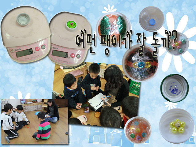 - 형님들의 초대장에 잘 도는 팽이의 무게는 5g이라고 적혀있는 것을 보고 아이들은 자신의 팽이 무게를 재보기도 합니다. 꽃잎반 친구들은 어떤 뚜껑을 사용했는가에 따라서, 또 어떻게 꾸몄는지 따라서 2g에서 6g까지 다양한 무게의 팽이들이 있다는 것을 알게 됩니다. 정말 5g짜리 팽이가 잘 도는지를 확인하기 위해서 시합도 해보았지요. 그런데 형님들의 말과 달리 3g짜리 팽이가 1위를 합니다.유아5: 형님들이 5g으로 하면 잘 돈다 그랬는데?!