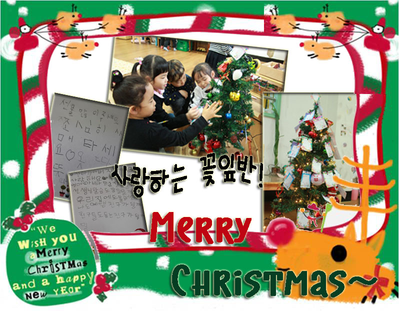 - 겨울은 춥지만 12월은 사랑이 가득하기에 따뜻한 것 같습니다. 이웃에게 사랑을 전하기도 하고, 사랑을 받기도 하는 날이 많은 날이지요. 특히 우리 어린이들에게는 신나는 크리스마스가 있기에 더욱 행복하고 따뜻한 겨울을 지낼 수 있는 것 같습니다. 꽃잎반에서는 크리스마스를 기념하기 위해서 교사도 동심으로 돌아가 아이들과 함께 신나는 캐롤도 불러보고, 우리가 크리스마스에 받고 싶은 선물을 적어서 트리에 달아 꾸며 봅니다. 우리의 진심어린 마음이 산타할아버지께 잘 전달되어야 한다며 산타할아버지께 사랑의 편지도 써보았지요. 이젠 사랑하는 가족과 함께 행복한 크리스마스를 보내는 일만 남았습니다. 꽃잎반 모두 사랑이 가득한 따뜻한 크리스마스 보내기를 기도합니다.