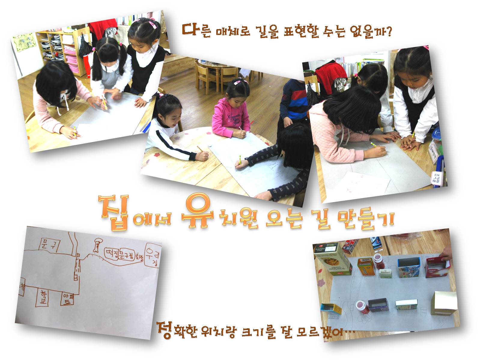 쌓기 영역에서 다양한 형태의 블록을 이용해 길을 만드는 모습을 보며 몇몇 유아들은 다른 매체를 활용해 길 만들기에 도전 합니다. 먼저 유아들은 <집에서 유치원으로 오는 길 만들기>라는 구체적인 목표를 세우고 유치원으로 오는 길에 어떤 것들을 볼 수 있는지 떠올리면서 그림으로 먼저 표현해 봅니다.