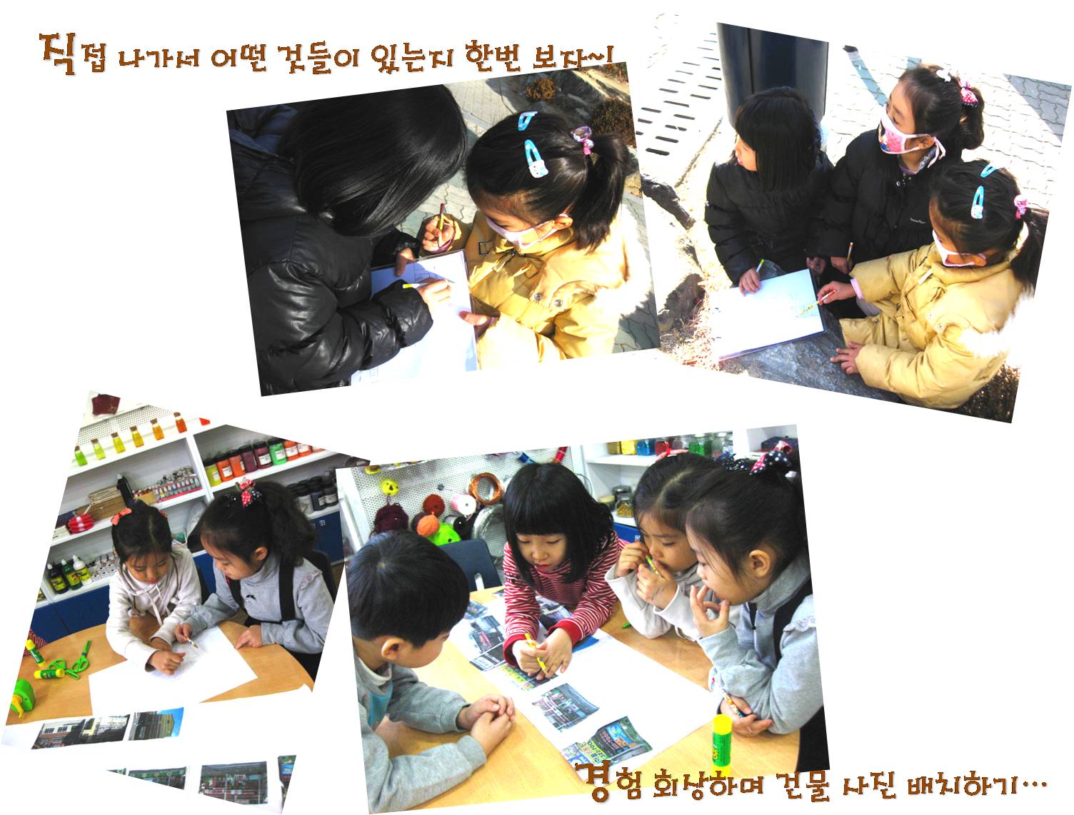 늘 지나다니는 길이지만 여러 건물들을 떠올려 그림으로 표현해 내기란 유아들에게 쉽지 않은 일인것 같습니다. 그래서 유아들과 밖으로 직접 나가 건물크기의 비율, 위치, 방향 등을 좀 더 구체적으로 살펴 보기로 합니다.“우와~ 이렇게 많은 건물이 있었어? 진짜 많다~!” “동평초등학교는 건물이 3개야~!” “건물 크기도 다 달라~ 동평초등학교가 제일 크고, 아파트가 제일 높아~!” “횡단보도가 3개씩이나 연결되어 있어~!”