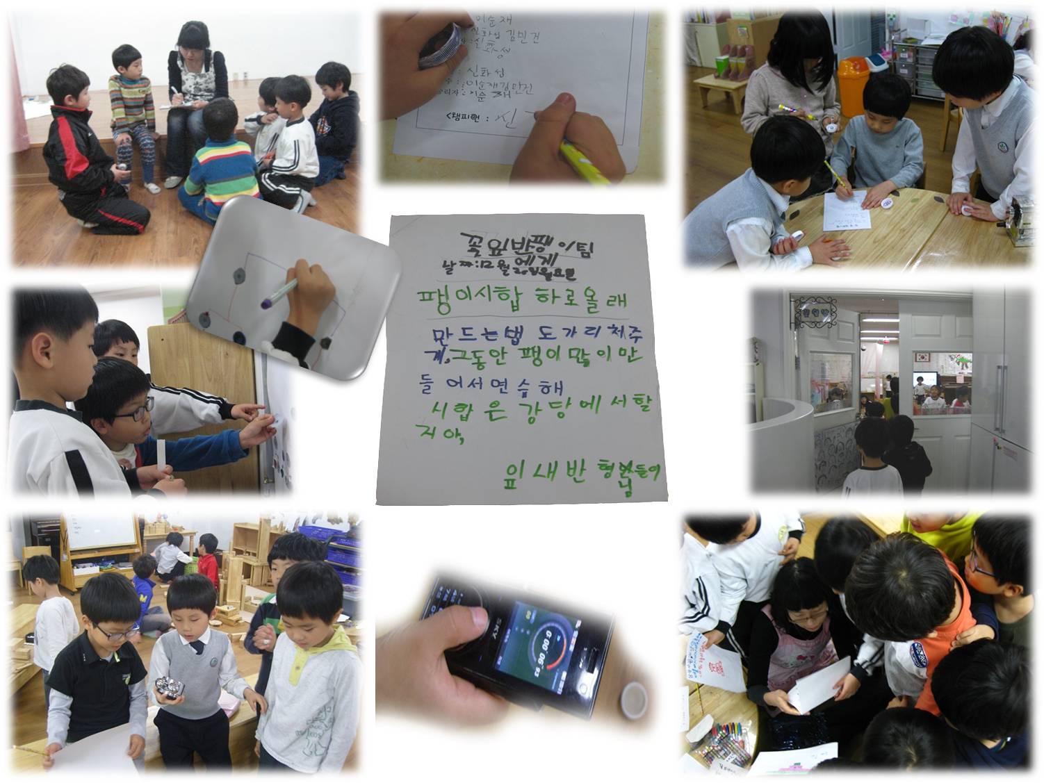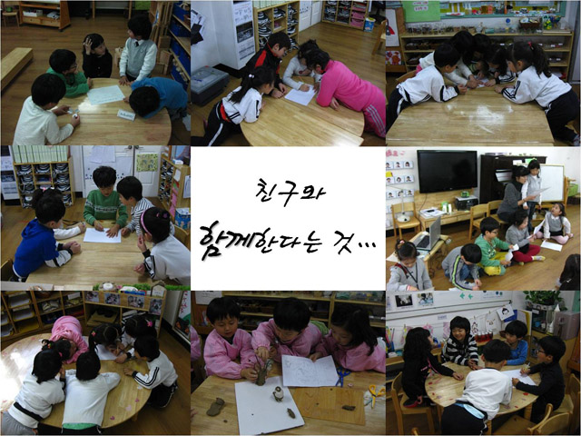 “횡단보도는 편의점 지나서 있었어. 그리고... 횡단보도가 끝나는 지점부터 동평초등학교 건물이 있었어.” 유아들은 유치원으로 오는 길을 표현하며 쉽게 지나쳤던 우리 주변의 다양한 사물과 건물들을 좀 더 민감하게 인식할 수 있게 됩니다. 2차원적으로 표현한 길을 입체적으로 표현하기를 계획하고 있는 유아들은 앞으로 어떤 것들을 경험해 나가게 될까요?<팽이 시합>몇 달동안의 연구를 통해 팽이에 쓰여질 구슬의 종류, 뚜껑의 종류, 팽이의 무게를 알아냈습니다. 잎새반 유아들은 이제 시합을 해도 되겠다는 판단을 내리고, 지금 우리반처럼 팽이를 많이 돌리고 있는 꽃잎반과 대결을 하기로 합니다. “선생님! 우리는 어떤 팽이가 잘 돌아가는지 알고 있으니까 동생들에게도 알려줘야 공평하지 않을까요?” 유아들은 정정당당한 것이 무엇인지 생각하며 대결장에 지금까지 우리가 연구해서 알게 된 정보들과 시합날짜를 적어 꽃잎반 동생들에게 가져다 줍니다. 유아: 선생님 대장을 뽑아서 제일 마지막에 돌리기로 해요! 교사: 왜? 유아: 원래 제일 센 사람이 제일 마지막에 하는거예요! 유아들은 매일 팽이를 제일 잘 돌리는 친구를 뽑고, 제일 많이 이긴 친구를 대장으로 선정 합니다. 얼마남지 않은 시합! 잎새반이 이길 수 있을까요?<친구와 함께 한다는 건...>