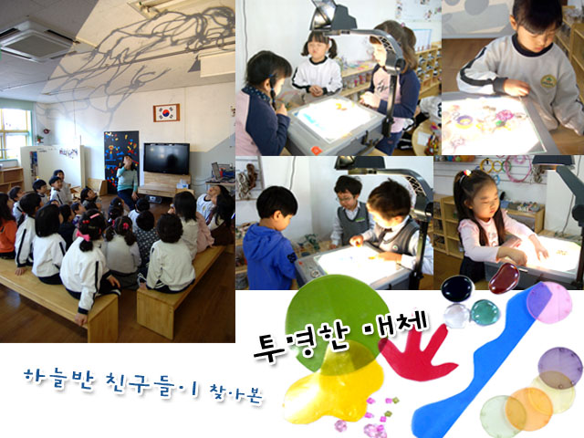어린이들은 계속해서 비닐, 유리, 얼음을 이야기 하였습니다. 아마도 매체의 투명한 성질을 이야기 하는 것 같았습니다. 그래서 하늘반에 있는 매체 중 투명한 매체와 불투명한 매체를 찾아 나누어보고, OHP위에 투명한 매체와 불투명한 매체를 각각 올려봅니다. 어린이들의 생각대로 투명한 매체에는 모두 그림자에 색이 나타났고 불투명한 매체에는 그림자에 색이 나타나지 않았습니다.