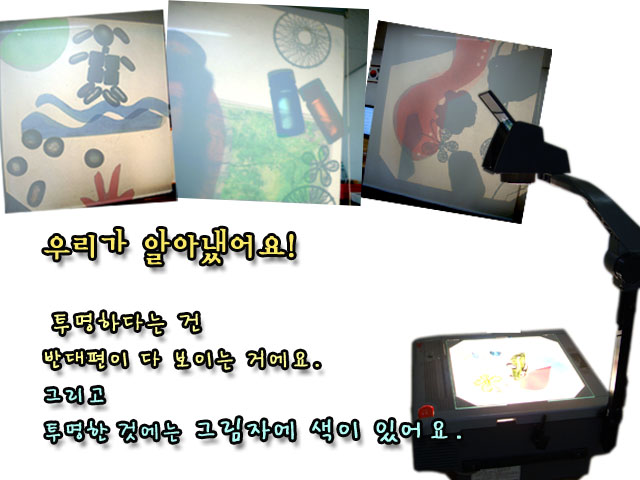“우리가 알아냈어요.” “이제 OHP위에 올려놓지 않아도 그림자에 색이 있는지 없는지 알 수 있어요." “투명하다는 건 반대편이 다 보이는 거에요. 투명한 것에는 그림자에 색이 있어요.!!”