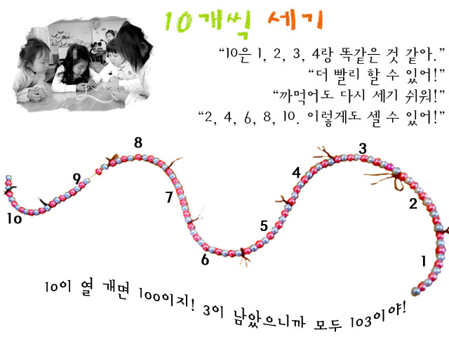 어느 날 친구들이 끼운 구슬을 다시 들여다보던 어린이들이 구슬을 세기 시작합니다. “2,4,6,810.... 26~! 이건 26이다.” “야~ 그거 100개도 넘을 것 같은데? 26아닐 걸.” 어린이들이 놀이에서 경험했던 것보다는 수가 훨씬 더 많은 구슬이었기 때문에 어린이들이 어떤 방법으로 수를 세는지 궁금했습니다. “1, 2, 3, 4... 27, 28...“ ”몇 개까지 세었어?“ ”나? 어....까먹었다!“ ”다시 1, 2, 3... 9,10. 여기까지 10이다.“ ”그럼 그냥 10개씩 하면 되잖아. 그게 더 쉽겠다.“ ”10이 10개다!“ ”어! 그럼 딱 100인데~“ ”여기 3개 남았으니까 103이다!“ ”10개씩 세니까 빨리 세었다.“ <10>으로 묶어 세는 것은 아무리 큰 수라고 해도 쉽게 셀 수 있도록 도와주었습니다.