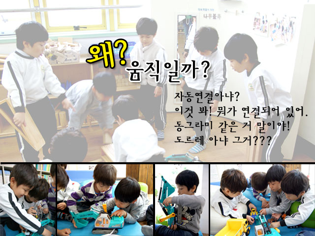 “이것 봐!! 진짜 신기하지? 손잡이를 돌리는데 포크레인도 같이 움직여!” “왜 그렇지?” “안에 자동연결이 되있는 거 아냐??” “맞다! 자동연결!” “그게 뭔데?” “뭔지는 잘 모르지만 자동연결이 돼 있어서 같이 움직이는 것 같은데!.” 그 중 가장 큰 관심을 보인 것은 저절로 움직이는, 자동연결이 되어있는 것입니다. 왜 그럴까를 생각하며 계속 관찰하다, 안에 무엇인가 손잡이와 연결되어있다는 것을 발견합니다. 그리고 교실에 있는 철사와 병뚜껑을 가져와 그것을 우리의 것으로 다시 재현합니다. “우와! 진짜 같이 움직이네~! 신기해!” 어린이들의 멋진 발견과 실행이 이어지길 기대합니다.