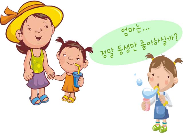 C:동생이 울면 엄마가 와서 안아주는데, 내가 울면 울지말라고 혼내셨어. C:엄마가 동생에게만 맛있는 음식을 주시는 것 같았는데. C:아니다. 나는 누나가 있는데. 누나보다 내가 잘 못하기 때문에 도와주는거다. C:그래. 엄마는 아빠, 나, 동생한테 똑같은 사랑을 줘.