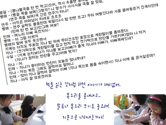 내가 진짜 엄마가 된 것처럼, 동생이 된 것처럼 목소리를 흉내내며 대본을 읽어보지만 목소리만으로는 영화의 느낌을 나타내기에 부족한 것 같습니다. T:혹시 드라마나 영화의 대본을 본 적이 있니? 그 대본에 보면 그냥 말하는 것만 적혀있는 것이 아니라 등장인물이 어떻게 말을 하고 어떻게 행동하는지도 적혀있는데...C:아. 나 그거 알아요. 괄호 안에 적혀 있는 것.