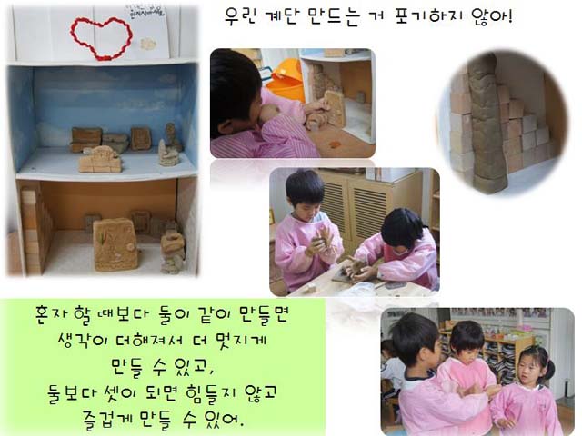 C: 진짜 계단의 개수를 알아야해. C: 직접 세어보니까... 11개였어! C: 그럼 1층에서 2층으로 갈 때 11개의 계단이 필요 한 거야. C: 우리는 집 안에 계단이 있는 거니까 예쁘고, 특이한 계단을 만들자! C: TV에서 돌아가는 계단을 본 적 있어! C: 난 옆에 손잡이가 있는 계단. C: 근데, 저번에 내가 계단을 만들다가 실패했는데... 같은 크기를 만들어서 쌓는 게 힘들었어. 잘 붙지도 않고... C: 우리가 같이 만들면 문제 없어! C: 도예시간에 물을 살짝 묻혀서 흔들흔들 했을 때 떨어지지 않는다면 잘 붙을 수 있다고 했어.