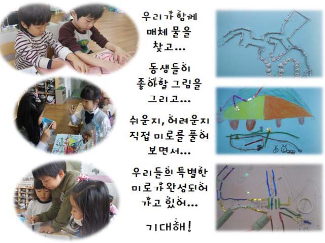 이슬반 친구들의 미로는 선물 받을 사람을 생각하며 만들고, 여러 가지 고민을 친구들과 함께 하고 있기 때문에 더욱 특별해 보입니다. 혼자보다 둘이 함께 만든 멋진 미로를 기대해 봅니다.