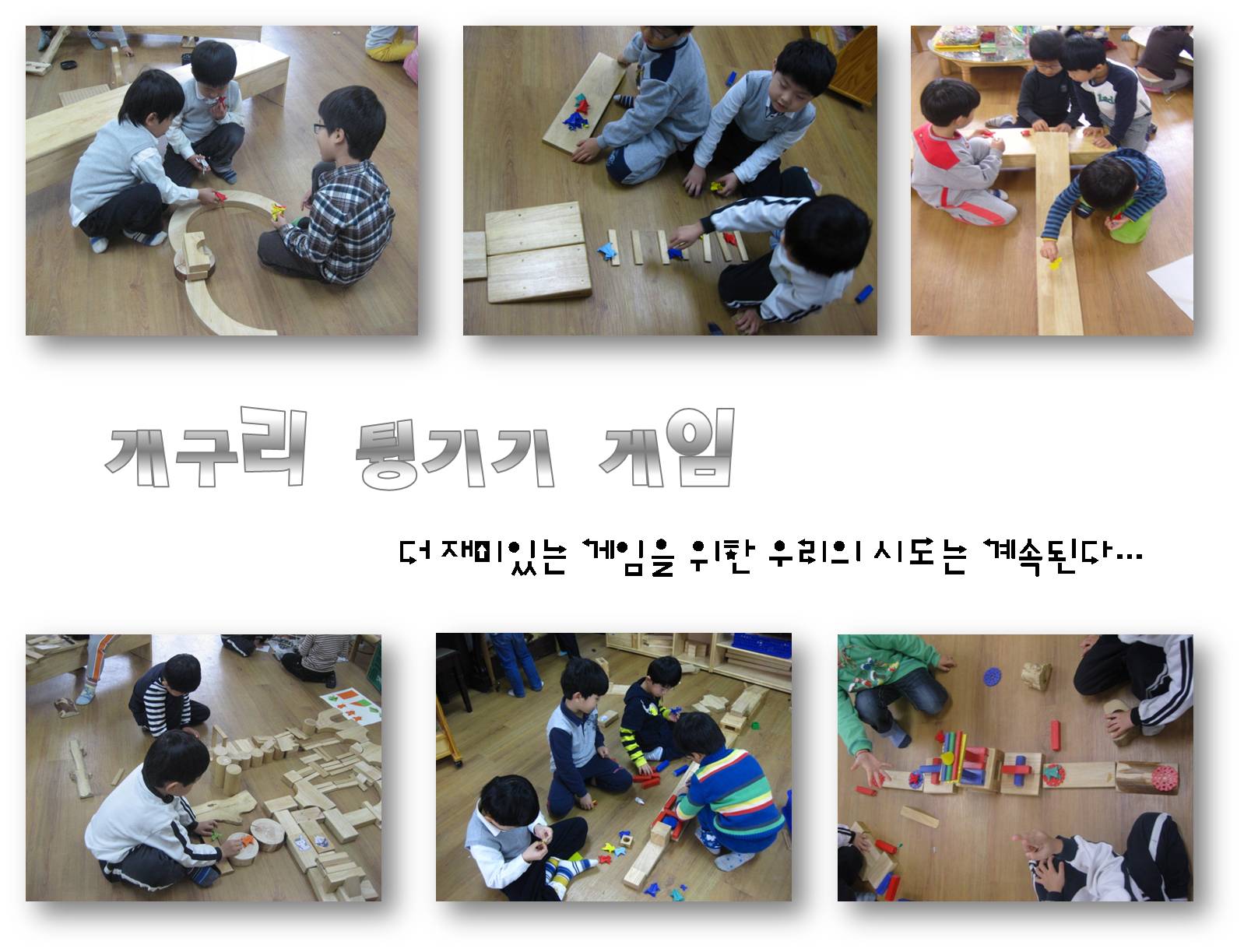 [개구리 튕기기 게임] 개구리 튕기기 게임은 색종이로 접은 개구리를 손가락 끝으로 튕겨서 가장 멀리 튕기거나 높이 튕기는 개구리가 이기는 형태로 진행되는 게임입니다. 처음에는 일렬로 줄을 지어 튕겨 가장 멀리 날아가는 개구리가 누구의 개구리인지를 알아보는 형태로 진행되었으나 점차 카프라로 튕겨 나간 거리를 기록하기도 하고, 장애물의 높이를 달리하여 가장 높이 뛰는 개구리를 찾으며 게임의 재미를 더해 가고 있는 중이랍니다. 또 개구리가 이동하는 길도 경사로, 동굴, 징검다리 등 다양한 형태로 바꾸어 가며 난위도를 높여가는 모습도 보이네요.