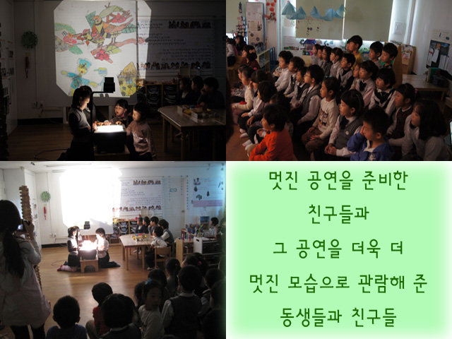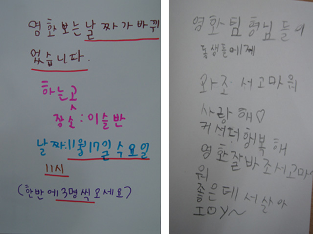 동생들과 잎새반 친구들이 한명씩 들어와 자리를 채웁니다. 공연을 준비한 친구들과 공연을 보기 위해 자리에 앉은 친구들 모두 떨리고, 기대하는 눈빛이 가득합니다. 영화가 끝나고, 준비한 편지까지 전해주면서 공연은 마무리 됩니다.