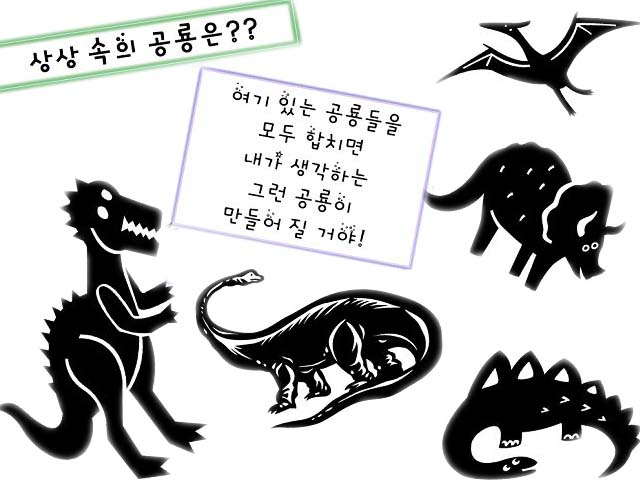 T: 상상 속의 공룡은 왜 만드는 거야? C: 공룡은 책이나 TV에서 볼 수 있는데, 내가 상상한 공룡은 아무데서도 볼 수 없기 때문에 만들어 보는 거야. C: 공룡은 지금은 없는 동물 같은 것이기 때문에... C: 상상의 공룡을 만들면 동생들이 나중에 보고 진짜 이런 공룡이 있었다고 생각할 거야. T: 너희들의 상상속 공룡은 어떤 공룡을 말하는 거야? C: 나만의 공룡? C: 바다도 다니고 하늘도 날고, 땅에서도 힘이 제일 세지! C: 음식은 풀을 먹지만 힘이 티라노보다 더 센 공룡!