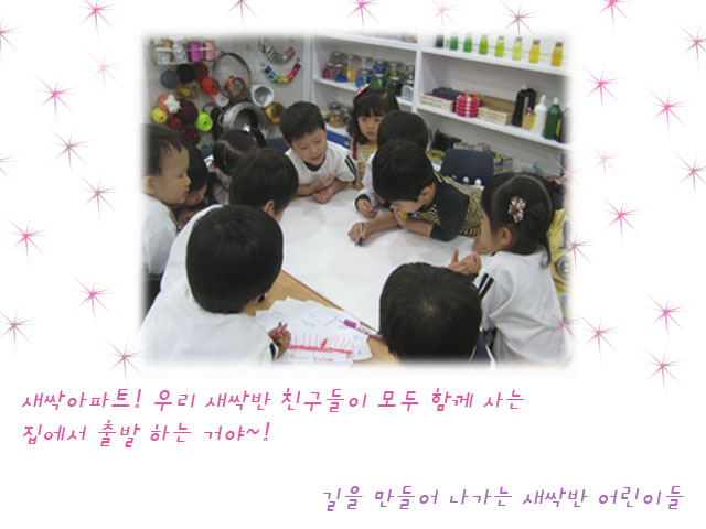 교사: 이 자동차는 어디서 출발해서 어디로 가는 거니? “우리 집이요.!” “아니야, 내 집이야” “그럼 다같이 사는 집!” “아~! 아파트” “새싹반 친구들 모두사는 아파트” “새싹 아파트” 교사: 그렇구나 그럼 새싹 아파트에서 출발해서 어디로 가는 거니?