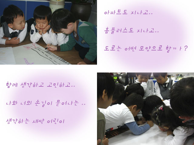 어린이들은 이렇게 출발지와 도착지를 정합니다.도착지까지 가는 길에 무엇이 있는지 이야기하기 전 나의 경험을 꺼내어 봅니다. “유치원 올 때 학교도 지나오고 빵집도 지나와요.” “나는 어묵가게도 지나와요.” “아파트도 지나오고 학교도 지나와요.” 교사: 그럼 정글숲 가는 길에는 무엇이 있니? “홈플러스!” “정글 슈퍼도 있어요. 거기서는 정글숲에 들어갔을 때 보호 해주는 거 팔아요.” “휴게소도 있어야 해요. 휴게소에 기름도 넣고 쉬어야 해요.” “학교도 있는데.” 이렇게 어린이들은 지난시간 활동을 바탕으로 더 멋진 아이디어를 내고 좀 더 구체적인 설계도를 만들어 나갑니다. “홈플러스 갈 때는 다리 길을 지나요.” “주차장 갈 때는 미끄럼길이예요.” 한 명 한 명 어린이들 의 생각과 그림이 모여 자동차가 다니는 길이 하나 둘 만들어져 나가고 있습니다.<새싹반 케이크>
