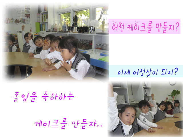 “맞아. 우리가 조금 있으면 6살이 되니까 졸업 케이크 만들자.” “졸업케이크?” “졸업은 5살이 지나고 6살이 되는 거야. 형님반에 가는거~” “그래 졸업케이크!” 단순한 생일의 의미보다 더 나아가 6살이 됨을 알고 새싹반 친구들과의 헤어짐을 아쉬워하는 마음에서 새싹반의 수료 케이크를 만들기로 하였답니다.“우리 케이크를 만들고 파티를 하자.”
