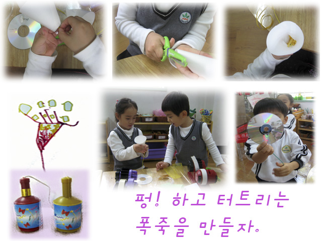 폭죽을 보았던 경험을 바탕으로 아이들은 폭죽 만들기를 해나갑니다. “폭죽 안에 구슬 같은걸 넣어.” “줄도 넣고~” “아니야, 구슬을 넣으면 와르르 다 쏟아져..”
