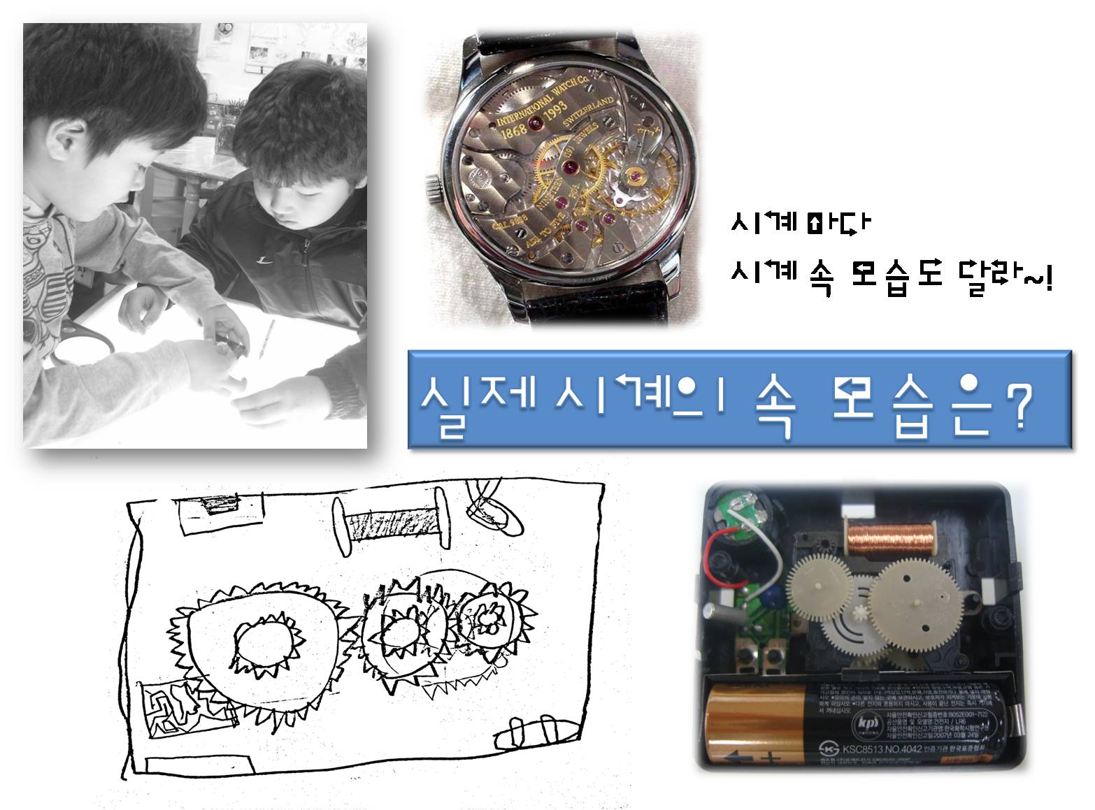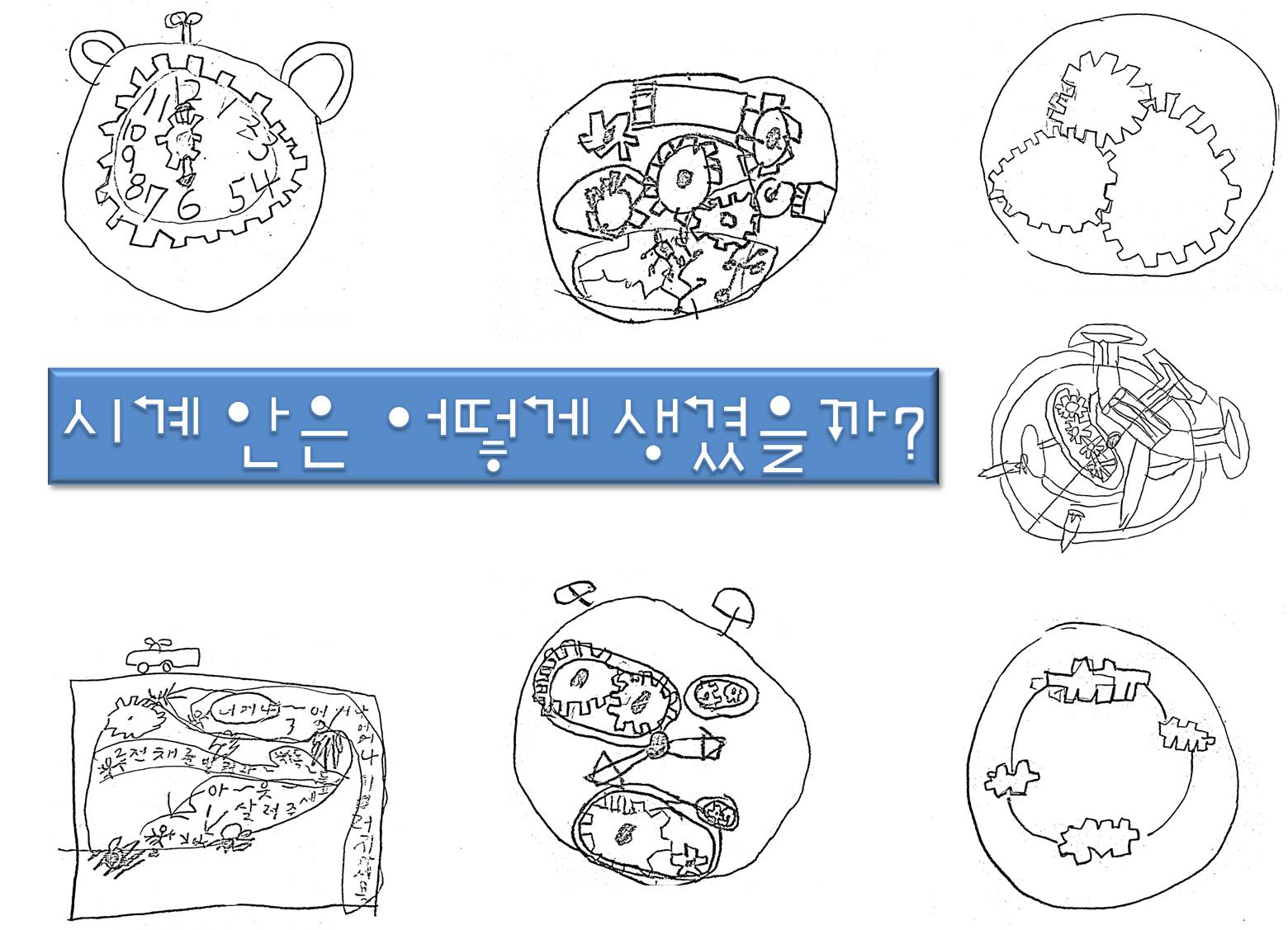 유아1: 시계 바늘을 움직일 수 있게 하는 작은 사람이 들어 있는게 아닐까요? 유아2: 큰 톱니바퀴가 전기로 다른 톱니바퀴에 힘을 전해 줘서 움직일 수 있을 것 같아요. 유아4: 자전거에 있는 톱니바퀴처럼 끈으로 연결이 되어 있어서 톱니바퀴가 움직일 수 있을 것 같아요. 유아6: 휴대폰도 많은 선들이 연결되어 있어서 작동이 되었었어요. 시계도 많은 전선들이 서로 연결되어 있지 않을까요?유아7: 시계 바늘은 시침, 분침, 초침이 있으니까 톱니바퀴도 3개가 있을 것 같아요. 유아8: 소리를 내는 기계가 안에 들어 있어서 시간이 되면 알람이 울릴 수 있는 것 같아요. 시계 안에 톱니바퀴가 들어 있다는 지식은 갖고 있는 유아들이 많았으나 그 톱니바퀴가 어떻게 맞물려 시계가 돌아가는지에 대한 것은 여전히 유아들에게 의문입니다. 유아들의 궁금증을 해결하기 위해 실제 시계를 분해 해 봅니다. “톱니바퀴가 겹쳐 있어요. 작은 톱니바퀴가 돌아가니까 큰 톱니바퀴도 조금씩 움직여요”, “톱니바퀴의 모양도 조금씩 달라요!”, “가장 빨리 돌아가는 톱니바퀴가 초침을 움직이는 톱니바퀴인가 봐요!” “시계 안은 엄청 복잡해요.” 유아들은 시계가 어떻게 작동하는지에 대해 호기심을 느끼고 실제 시계 속을 관찰해 보면서 시계의 작동원리에 대해 더 큰 관심을 갖게 되었답니다.