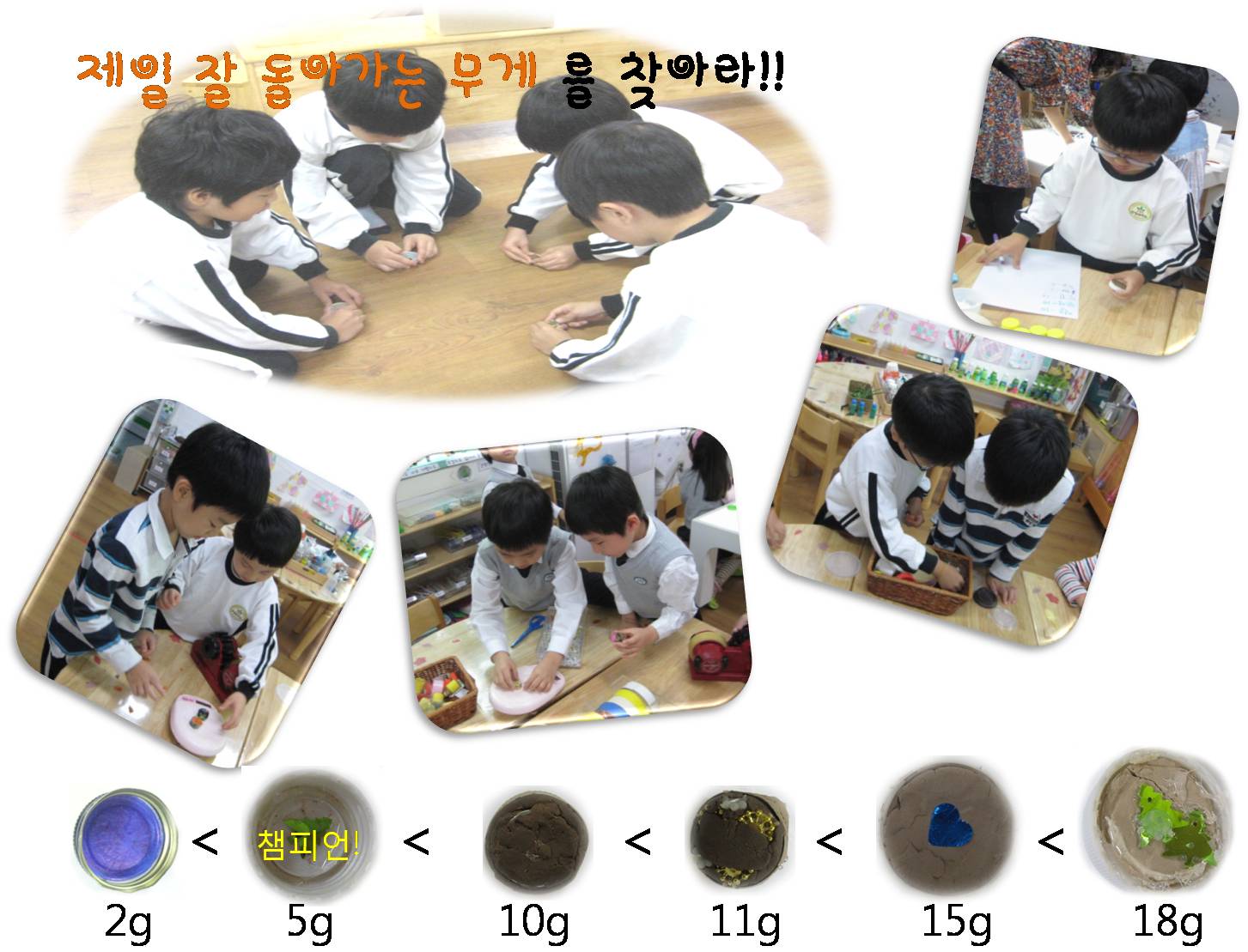 <동화내용 녹음하기> 동화를 들려줄 때 마다 대사를 반복해서 읽는 것에 대해 번거로움을 느낀 <무서운 동화 팀> 유아들은 동화내용을 녹음하기로 합니다. 자신이 목소리를 내고 싶은 등장인물을 정하고 녹음을 해봅니다. 유아1: 뭔가 허전한 것 같아. 유아2: 지난번에 인형극 보러 갔을 때 시작할 때랑 끝날 때 음악이 나오던데? 우리도 음악을 넣으면 어떨까? 유아3: 무서운 장면에서는 실제로 무서운 것 처럼 목소리를 내야 더 실감날 것 같아. 유아4: 귀신의 집에서 걸어가는 장면에서 <똑딱똑딱> 소리를 진짜 발자국소리처럼 내면 좋을 것 같아. 유아5: 동화가 끝나면 신나는 동요를 틀어줘서 친구들이 따라 부를 수 있게 하면 좋을 것 같아. 동화에 어울리는 음악과 효과음 삽입으로 동화는 더 흥미진진해 지게 될까요?<팽이만들기> 유아들은 2보다 크고, 18보다 작은 수를 적어두고, 매일 무게를 재어보며 차례대로 만들기를 해 시합을 합니다. 유아들은 여러번의 시합을 통해 무게 <5g,10g,11g,15g> 중에서 5g의 팽이가 가장 잘 돌아간다는 결론을 도출하게 됩니다. "지난번에 계속 1등했던 팽이도 5g이였어! 팽이는 5g 일 때 제일 잘 돌아가나봐!!” 유아들은 실험을 통해 CD보다는 뚜껑이 더 잘 돌아간다는 사실과 팽이가 돌아가는 속도에 무게가 중요한 영향을 미칠 수 있음을 발견하게 됩니다. 교사: 이 팽이만 갖고 있으면 무조건 1등하는거야? 유아1: 아니요. 잘 돌리는 친구가 돌려야 잘 돌아가요. 유아2: 그런데 누가 잘 돌리는데? 유아3: 같은 팽이로 다 돌려보면 알지! 유아4: 그럼 시간을 재야겠다! 잎새반에서 팽이를 가장 잘 돌리는 친구는 누구 일까요?