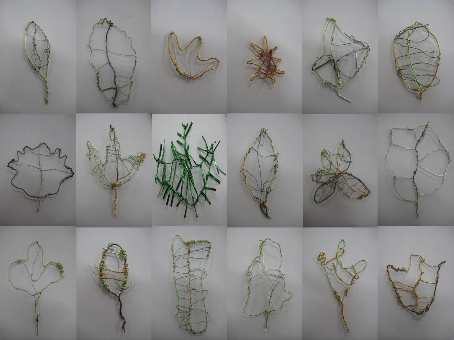 유아4: 한 가지 색이 아니라 여러 가지 색이 섞여 있어요. 유아5: 색이 연한 부분도 있고, 진한 부분도 있어요. 유아들은 나뭇잎의 형태와 색을 관찰하여그림으로 표현하면서 나뭇잎마다 서로 다른 특징을 지니고 있음을 발견하게 되고, 같은 나뭇잎도 크기나 모양, 색 등이 다름을 발견하게 됩니다. 그리고 나뭇잎을 구성하고 있는 잎맥에 대해서도 자연스럽게 관심을 갖게 됩니다. 이번에는 선의 연결을 잘 드러낼 수 있는 철사를 활용해 나뭇잎을 표현해 봅니다. 나뭇잎을 철사라는 매체를 이용해 섬세하게 표현하기란 쉽지 않지만 유아들은 철사를 한 줄씩 연결해 나가며 잎맥에 대해서 더 자세히 관찰하고 많은 잎맥의 존재이유에 대해서도 의문을 느끼게 됩니다.