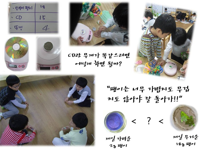 잎맥의 역할에 대해 함께 생각해 보며 잎새반 친구들과 행복한 주말 보내세요~<팽이만들기> “CD무게와 뚜껑의 무게를 같게 하려면 어떻게 하면 될까?” 유아1:스팽글을 더 많이 붙여! 유아2:그건 가벼워~ 유아3:무거운게 뭐가 있지? 유아4:찰흙을 넣어보면 어떨까? 유아들은 CD와 무게를 맞추기 위해 뚜껑속에 찰흙을 넣고, 저울을 달아봅니다. 유아1:무거워 졌어! 유아들은 신기해 하며 CD와 뚜껑의 무게를 같게 만들고 시합해봅니다. 시합결과는 뚜껑의 승리! 유아들은 매일 이기던 CD가 무거워서 시합에서 이긴 것은 아니라는 것을 알게됩니다. 그리고 시합을 하면서 친구들 중 제일 가벼운 2g의 팽이와 제일 무거운 18g의 팽이가 계속 지는 것을 발견합니다 “팽이는 너무 가벼워도 무거워도 안돌아가!”, “2보다는 무겁고, 18보다 가벼우면 되지 않을까?”, “우리가 그 무게를 찾아보면 어떨까?” 유아들은 가장 잘 돌아가는 팽이의 무게를 찾을 수 있을까요?