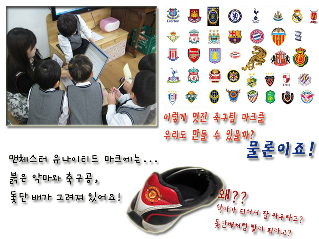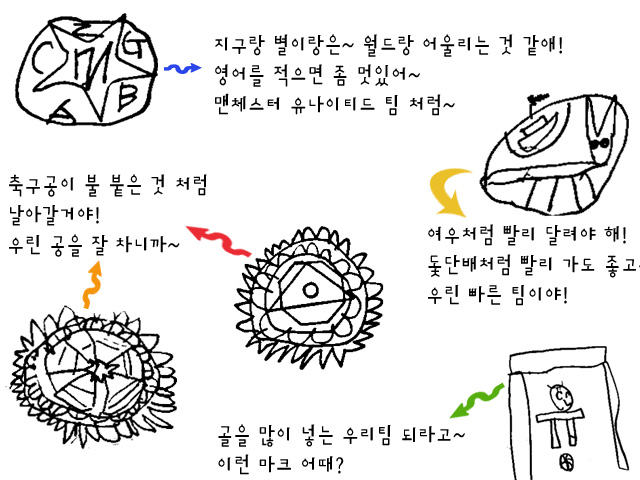 -우리 축구팀에도 마크가 필요하기에 아이들은 머리를 맞대고 각자의 팀에 어울리는 마크를 디자인해봅니다. 여러 친구들의 생각이 모이면 더 멋진 아이디어가 생긴다는 것! 각자가 만든 마크의 의미를 비평적으로 읽어보고 최고의 마크를 만들어보기로 합니다.