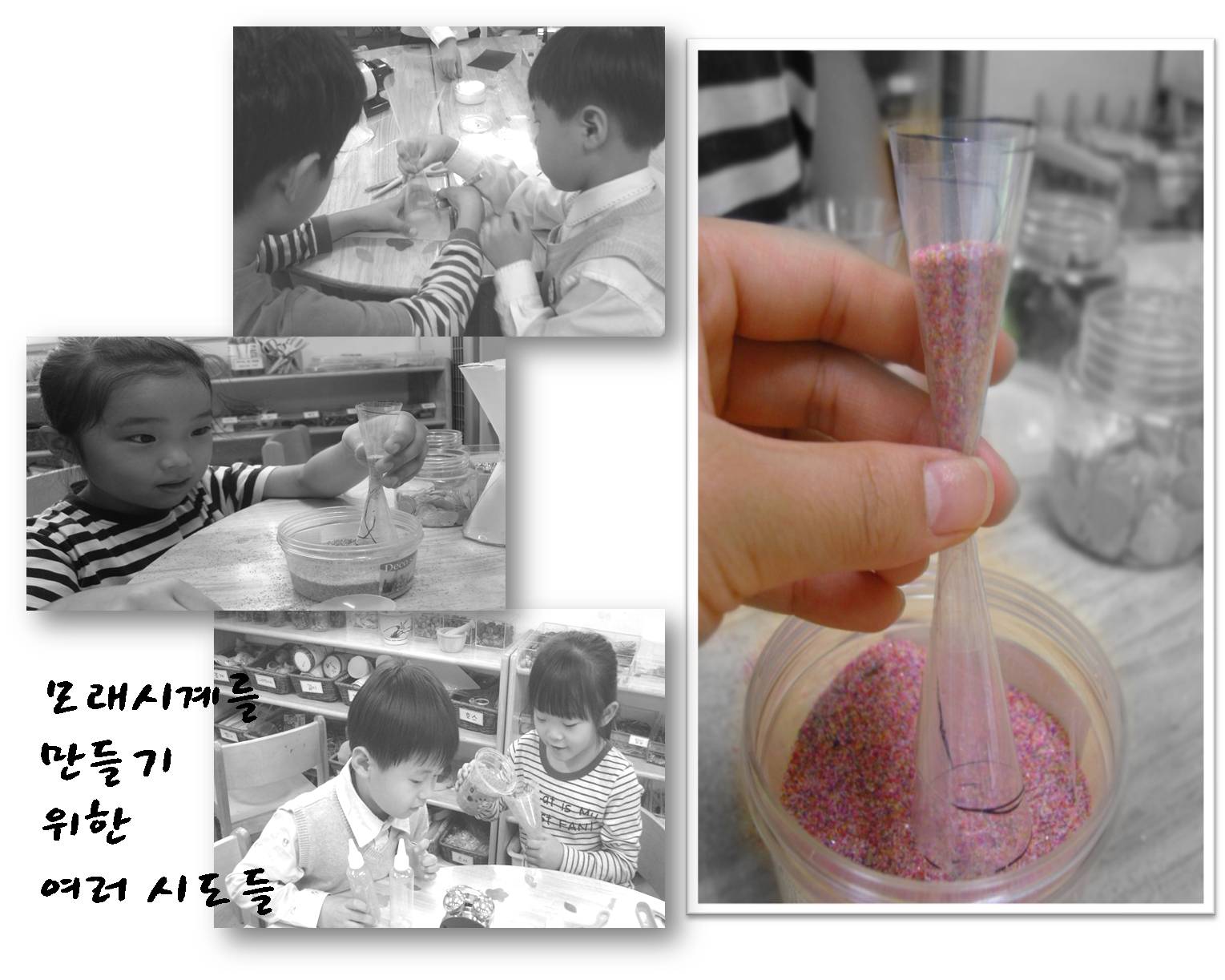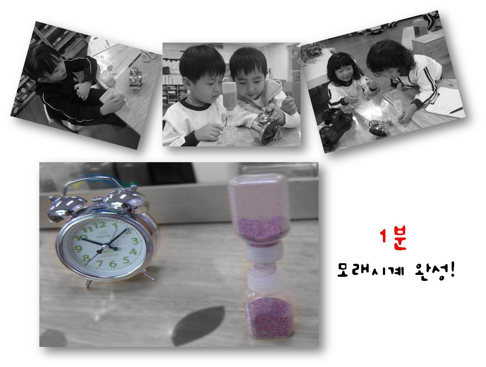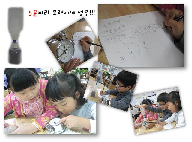 "이거면 되겠어요. 투명해서 안도 보이고, 눈금이 있어서 모래를 얼마큼 넣었는지도 알 수 있잖아요!" 유아들은 물약통의 입구 부분을 조금 잘라내어 구멍을 낸 다음 양쪽을 고정하여 모래시계를 만드는데 성공합니다.유아들은 자신이 만든 모래시계가 얼마만큼의 시간을 잴 수 있는 모래시계인지 알아보기 위해 실제 시계를 이용하여 측정합니다.