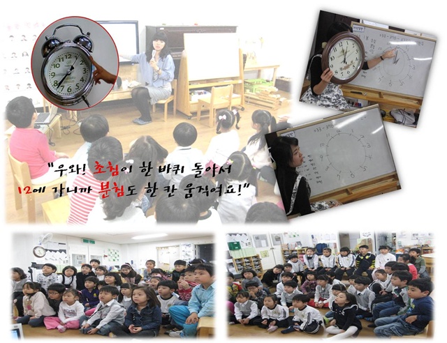 유아들: 1바퀴, 2바퀴, 3바퀴, 4바퀴...... 어?4에서끝났어요. 교사: 시계에서 4는 몇 분을 가리키는 걸까? 시계에서 가장 긴 바늘이 한 바퀴가 돌면 두 번째로 긴 바늘은 몇 칸씩 움직였지? 유아들: 1칸! 아~1분이요~! 교사: 그럼 4까지는 몇 칸일까? 유아들은 눈금 한 칸, 한 칸을 다 세어 봅니다. 유아1: 20이예요! 교사: 그럼 5분이 되려면 얼마만큼의 시간이 모자란 걸까? 유아2: 1분이 60초고... 20초 만큼 갔으니까.... 유아들은 숫자 4에서 부터 12까지 몇 개의 눈금이 있는지 세어 봅니다. 유아3: 40칸 이예요! 40초 만큼의 모래가 더 필요해요! 유아4: 아~ 6에서 2를 빼면 4니까 60에서 20을 빼면 40이네! 그렇게 해서 유아들은 40초 동안 떨어질 만큼의 모래를 4분 20초 모래시계에 넣어 5분을 완성하게 됩니다. 모래시계 만들기 활동을 계기로 잎새반 친구들이 시간에 대한경험이 어느 정도 있는지 함께 이야기를 나누어 봅니다. 먼저 시계에 있는 시침과 분침, 초침을 살펴본 뒤, 초침이 한 바퀴를 돌 때 분침의 변화모습을 관찰합니다. 유아들: 우와! 초침이 한 바퀴 돌아서 12에 가니까 분침도 한 칸 움직여요! 분침이 한 칸 움직이기 위해서는 몇 초가 필요한지를 계산해 보기 위해 유아들과 초의 움직임을 따라 수를 세어 봅니다. “1초, 2초, 3초.... 60초! 60초가 되면 긴 바늘도 한 칸 움직여요! 60초는 1분이랑 같은 거네요?” “그럼 긴 바늘이 한 바퀴 돌면 어떻게 되는 거지?” “짧은 바늘이 다른 숫자로 이동해!” 알면 알수록 더욱 신기한 시계! 시간을 측정해 보고 시계를 탐구해 나가며 시계에 대한 호기심은 더 커져만 갑니다. 앞으로 잎새반 친구들이 시간에 대한 경험들을 어떻게 심화된 경험으로 확장해 나갈지 기대해 주세요!