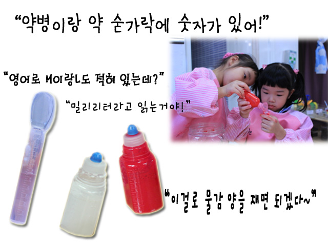 -형님반에서 약병에 담긴 물감을 보고 돌아온 꽃잎반 친구들은 약병에 물감을 넣어 측정하기로 합니다.