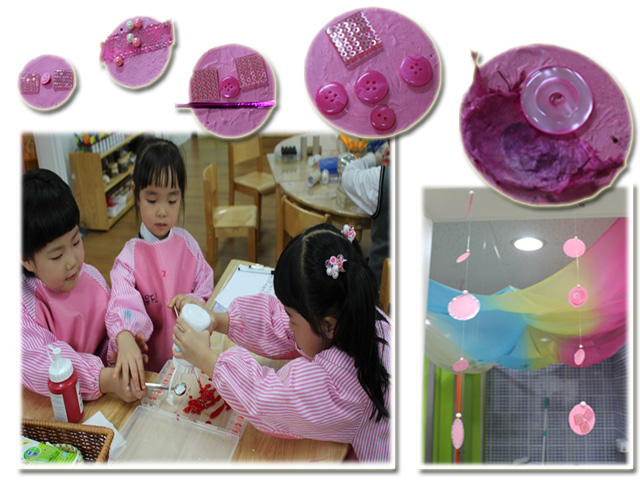 -미리 만들어 둔 물감과 동일한 양으로 분홍색 아크릴 물감을 만들어 자개를 꾸미고, 다양한 분홍색 매체도 붙여서 드디어 꽃잎반의 분홍색 모빌은 완성이 되었습니다. 교실 안 분홍색에 대한 호기심으로 시작한 아이들의 탐구심, 끊임없이 연구하고 즐겁게 활동에 몰입하면서 아이들은 과학자도 되어 보고 예술가도 되어봅니다. 아이들은 또 어떤 재미있는 놀이와 탐구를 시작하게 될까요? 무궁무진한 능력을 가진 우리 아이들, 앞으로의 활약도 기대해봅니다.