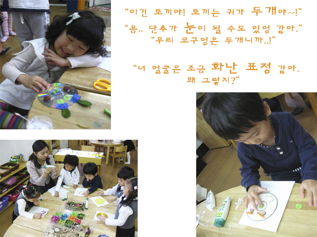 “너 얼굴은 화난 얼굴 같애.” “어! 너는 콧구멍을 두 개로 붙였네?” “우리 입술은 위에 하나 밑에 하나 있는데 왜 너는 뿅뿅이 3개만 붙였어?” “웃을 때. 웃을 때 붙어 있잖아.” “그렇게 붙이니깐 입술모양 같지 않아.”
