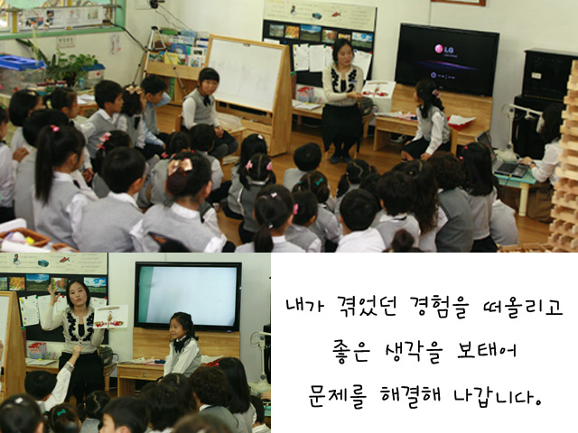 이슬반 친구들은 공유시간을 통해 놀이 시간에 있었던 활동 중에서 재미있었던 것을 소개하거나, 어려운 점이 있어서 해결하고자 하는 것을 이야기 합니다.