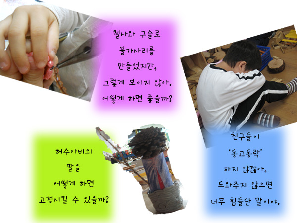 T: 갑자기 왜 공룡을 만들게 되었어? C: 우리가 초등학생이 되어서 동생들이 이슬반에 오게 되면 우리가 만든 공룡을 보고 만들 수 있게 하기 위해서... T: 공룡 만들 때 어떤 점이 어려운 것 같애? C: 세울 수 있게 하는 것? C: 목과 몸, 다리와 몸, 꼬리와 몸을 연결시키는 게 어렵지. T: 문제를 해결할 수 있는 방법은 없을까? C: 우리가 만들어서 친구들에게 알려주자!형님들의 공룡을 보면서 만들고, 동생들에게 남겨 주고 싶다며 ‘도전’하는 아이들의 공룡이 어떤 공룡보다 멋져 보입니다. 공룡을 만들면서 생기는 문제점을 잘 해결하여 근사한 공룡이 될 수 있도록 기대해 봅니다.