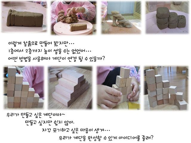 T: 찰흙으로 계단을 만들기 전에 가베로 먼저 계단을 만들어 볼까? C: 이 작은 네모로 쌓은 계단이 튼튼할 것 같은데... C: 아니야! 우리가 만들려고 하는 계단은 둥글게 올라가는 계단이잖아? T: 지금 쌓고 있는 가베를 찰흙으로 만들어 볼까? C: 진짜 쉬워! 그냥 똑같은 크기로 쌓기만 하면 되지. C: 어? 자꾸 무너져! 잡아봐. C: 잡아도 자꾸 무너진다. C: 다른 방법이 없을까? C: 아까 친구들 말처럼 같은 모양을 많이 만들어서 쌓아 올리면? C: 잘 안돼. 어려워. 포기할까?