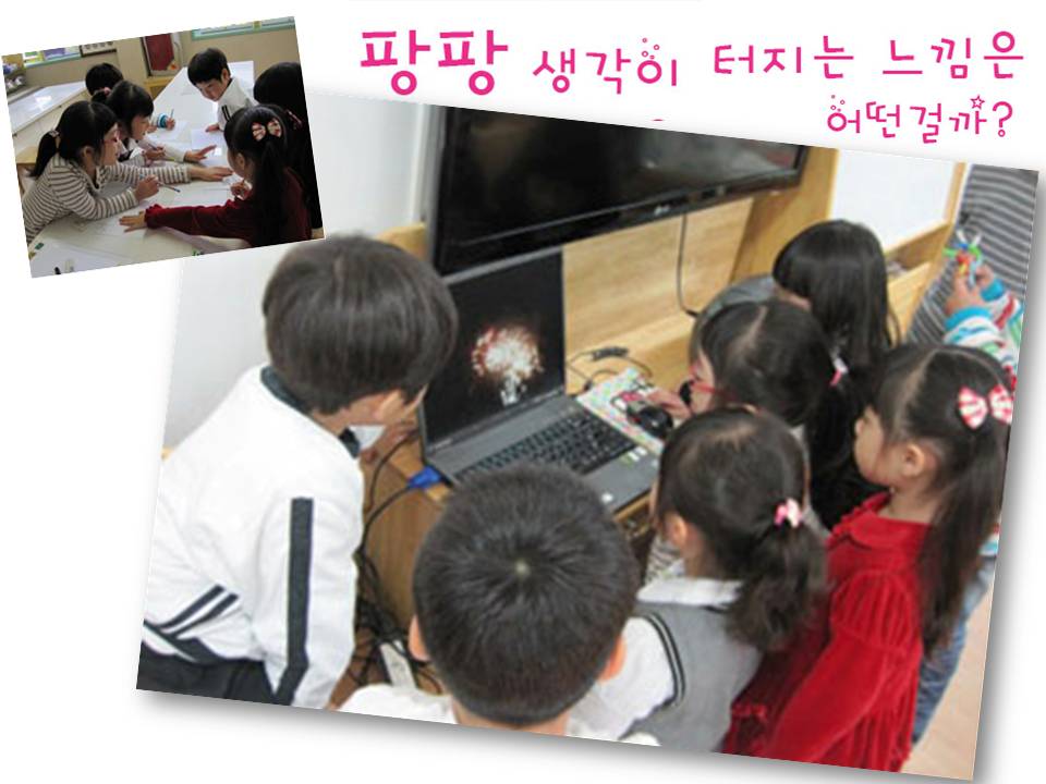 유아6: 나는 로켓트가 생각 나는데. 로켓트 발사할 때 꼬리에서 <펑> 터지면서 연기랑 불꽃도 나고, 아주 높이 올라갔거든.서로의 경험 나누기를 마친 후 우리는 <팡팡 터진다>는 느낌을 다시 <생각>과 연결시켜 봅니다.