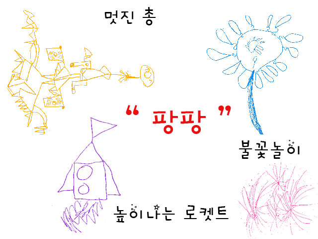 친구들은 가장 친숙한 <음식>에서부터 <터진다>는 느낌을 찾아냅니다. 그리고 서로의 경험을 이야기 나누며 좀 더 다양한 소재거리로 넓혀가기 시작합니다.유아4: 나는 멋진 총에서 총알이 나올 때 <팡팡>터지는 느낌이 생각났어. 거기는 불꽃도 나오고 소리도 들리거든.