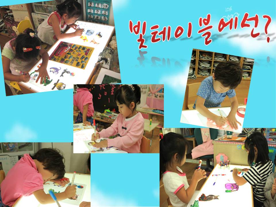 교사: 빛테이블에서 너희들이 그린 그림을 함께 보려고 가지고 왔어~