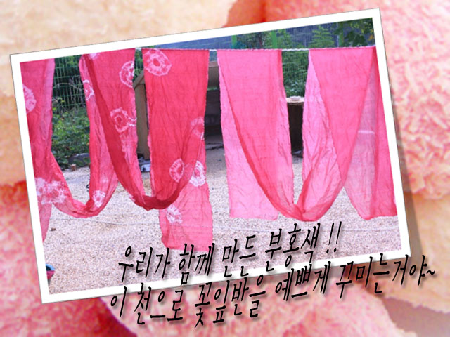 - 꽃잎반은 다양한 색을 염색해 볼 수 있는 염색 체험 현장에 다녀왔습니다. 우리 꽃잎반은 꽃잎반의 ‘분홍색’을 염색해보기로 하였지요.