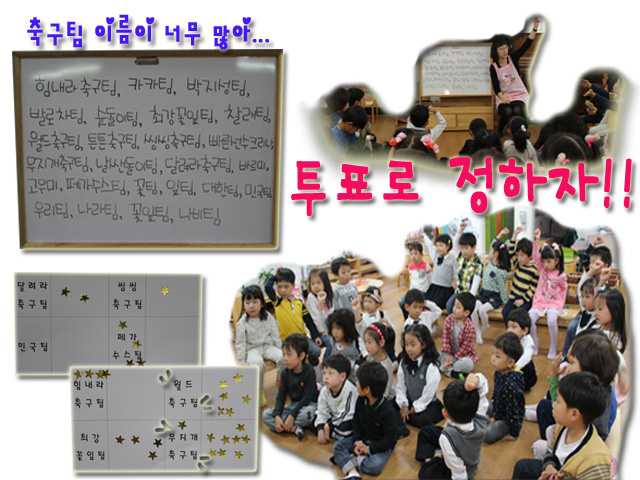 교사: 우리 꽃잎반 축구팀 이름은 친구들이 가장 많이 선택한 “월드 축구팀”이랑 “무지개 축구팀”으로 하겠습니다!