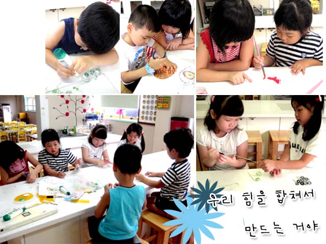색체계획과 매체계획을 바탕으로 기분이 좋은 눈을 함께 만들어봅니다. 서로 자신 있게 만들 수 있는 것을 이야기 나눈 후 역할을 나누어 만들어보기로 합니다. “나는 힘이 세니까 철사를 구부릴게.” “나는 물감을 잘 색칠 할 수 있어.” “찰흙으로 어떻게 꽃모양을 만들지?” "내가 도와줄게. 나랑 같이 만들자.”