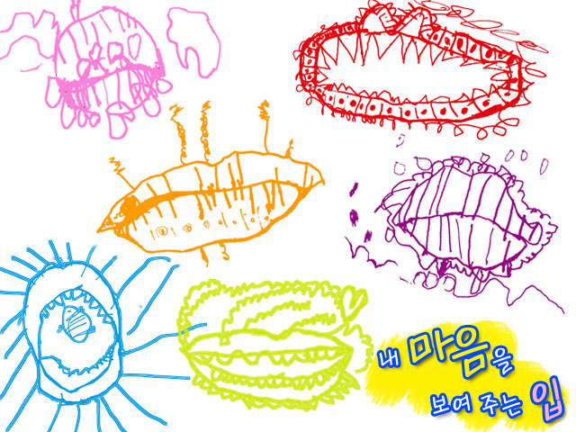 ‘내 마음을 보여주는 입’에 대해 고민하게 되면서 어린이들은 그동안 여러 전략들로 자신의 생각을 확장시켜 나갔습니다. 지금까지 나무, 사람, 꽃 등의 구체물만을 주로 그려왔던 어린이들에게 형태 없는 마음을 그리는 것은 굉장히 낯선 일이었는데, 어린이들은 곧 그것이 누가 더 잘 그리냐의 문제를 떠나 자신의 표현인 것을 알아채자 굉장히 흥미로워하며 자유롭게 자신의 생각을 표현 해 냈습니다.